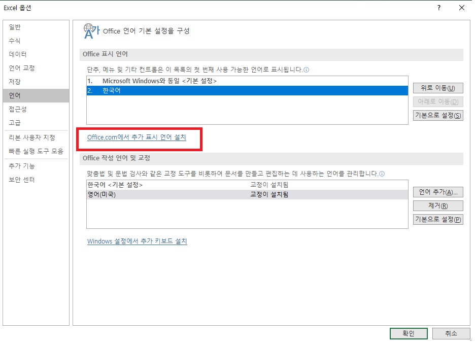 Office.com에서 추가 표시 언어 설치 클릭 해주세요