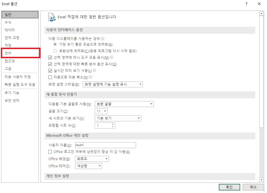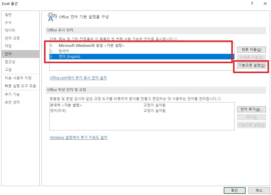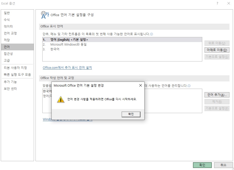 * 엑셀 한글버전에서 영어버전으로 변경되었는데 MS 오피스 전체가 영어버전으로 변합니다.