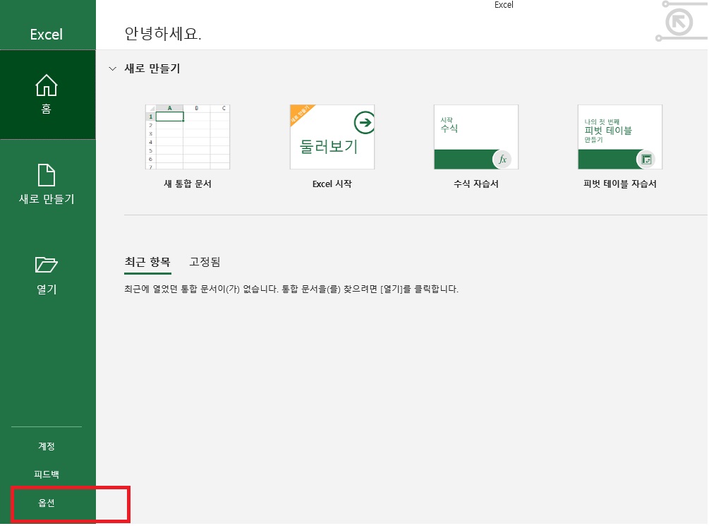 엑셀을 시작하면 아래와 같이 나오는데 왼쪽 하단에 옵션을 클릭 해주세요.
