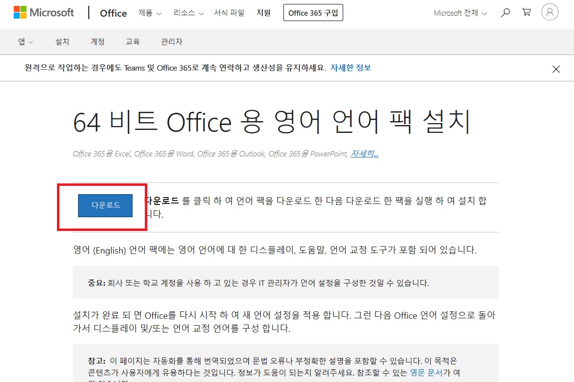 클릭하면 선택한 언어버전이 있는 Office.com 홈페이지 다운로드 페이지로 이동합니다.