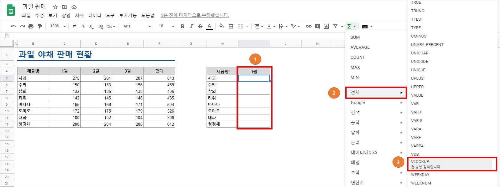 3번 : VOOKUP(검색할_키, 범위, 색인, 정렬됨)
