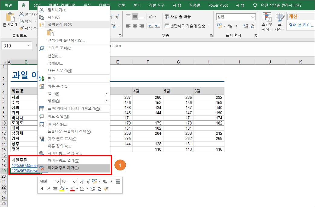 2. 적혀있는 이메일 마우스 오른쪽을 클릭 후 "하이퍼링크 제거"클릭