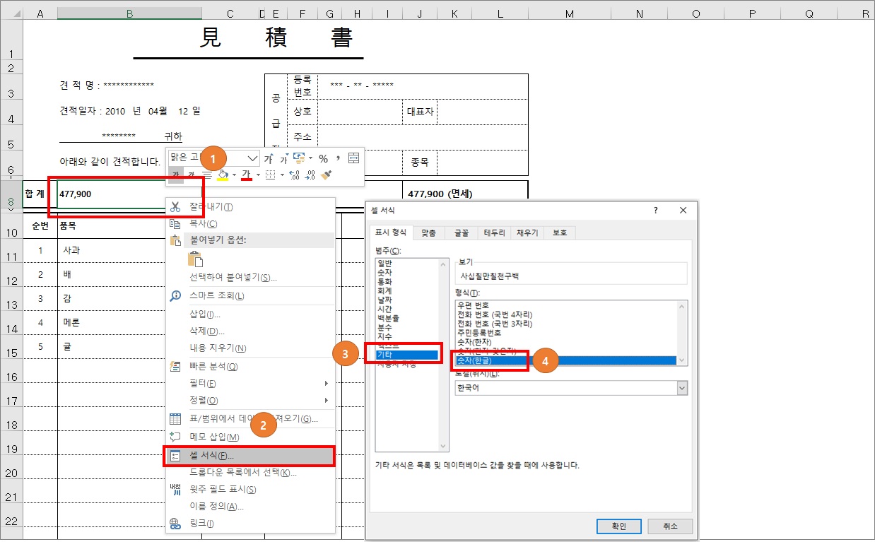 엑셀에서 숫자를 한글로 보여줘야하는 경우가 있습니다.