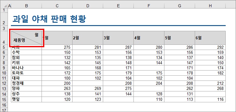 아래와 같이 대각선으로 구별한 후 행과 열에 들어갈 제품명과 월을 입력해보겠습니다.
