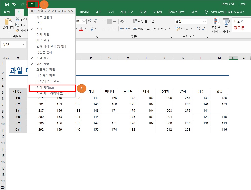 1번 : 빠른 실행도구 모음 사용자 지정 클릭
