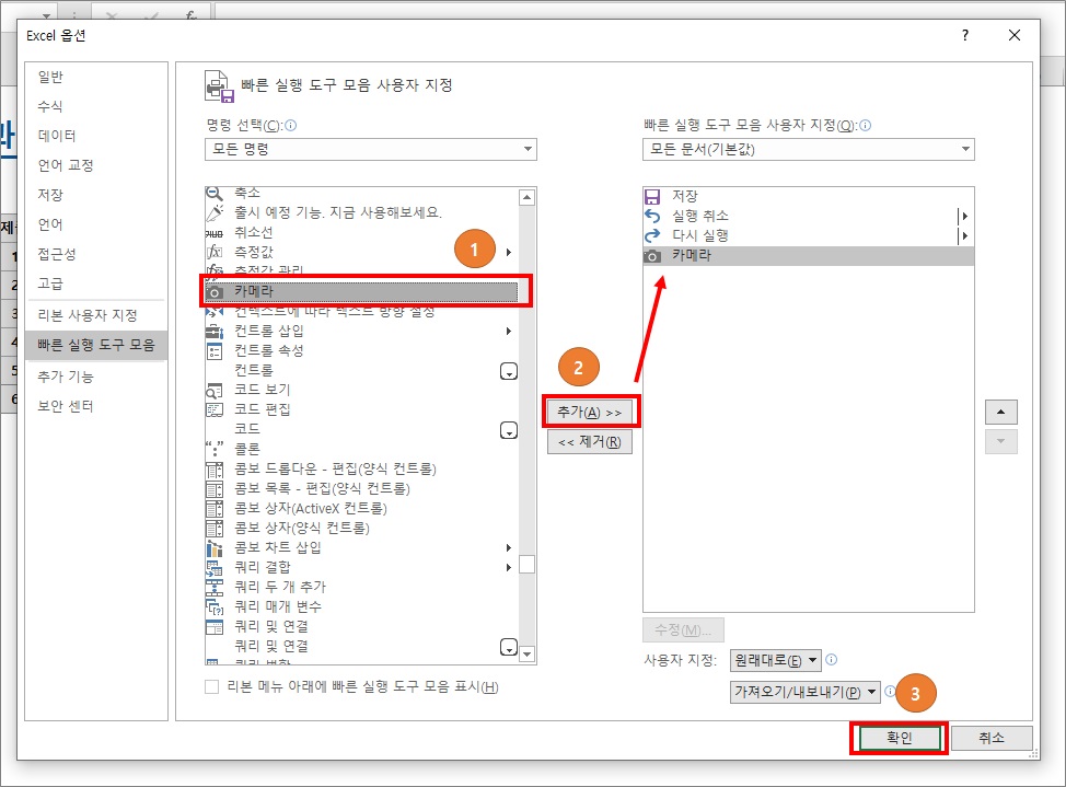 2번 : 추가 클릭 오른쪽 빠른 실행 도구 모음 사용자 지정에 추가 됩니다.