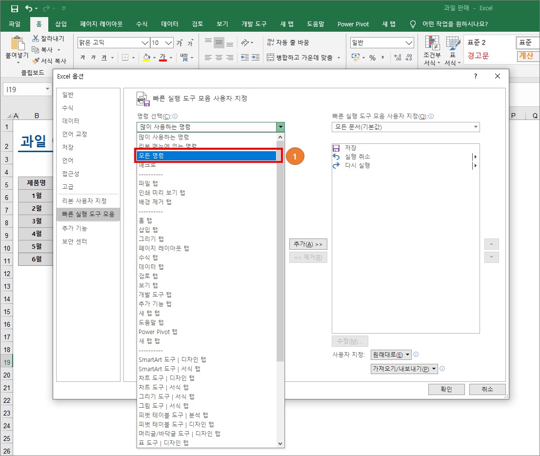 1번 : 빠른 실행도구 모음 사용자 지정 클릭