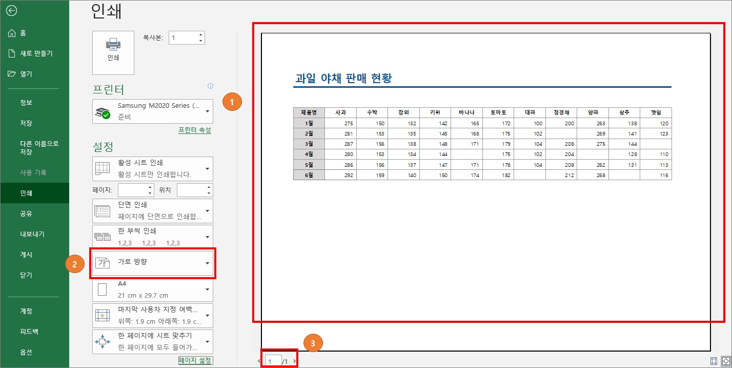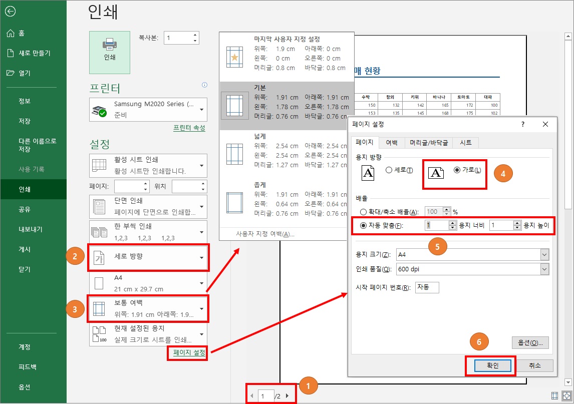 2번 : 가로형태, 세로 형태 어느 형태로 인쇄되는지 확인 , 가로형태 선택