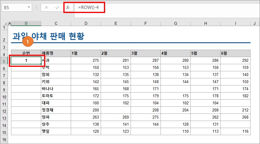 1번 : 순번을 입력할 셀 선택하여 입력 진행 ROW()-4