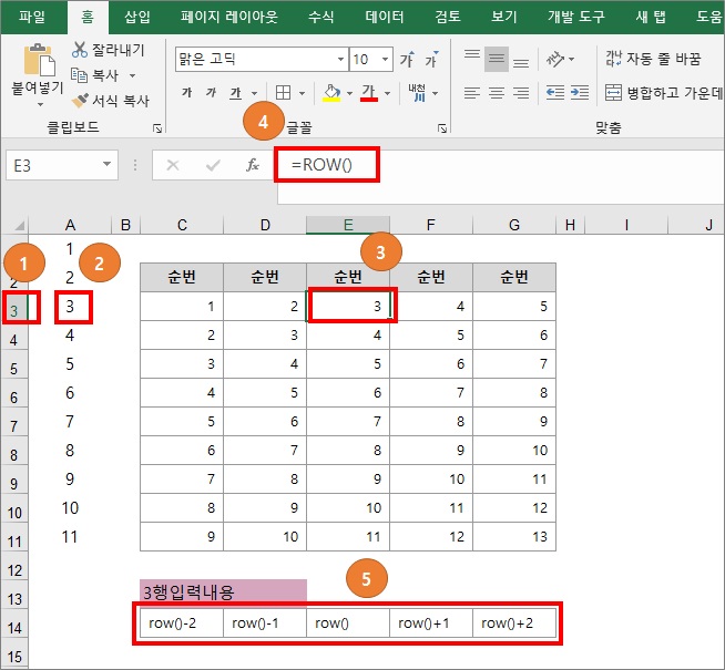 왜? ROW() 입력하면 5가 되는이유는 행번와 동일하게 입력된다고 보시면됩니다 지금 1번이 5행에 있기 때문에 5