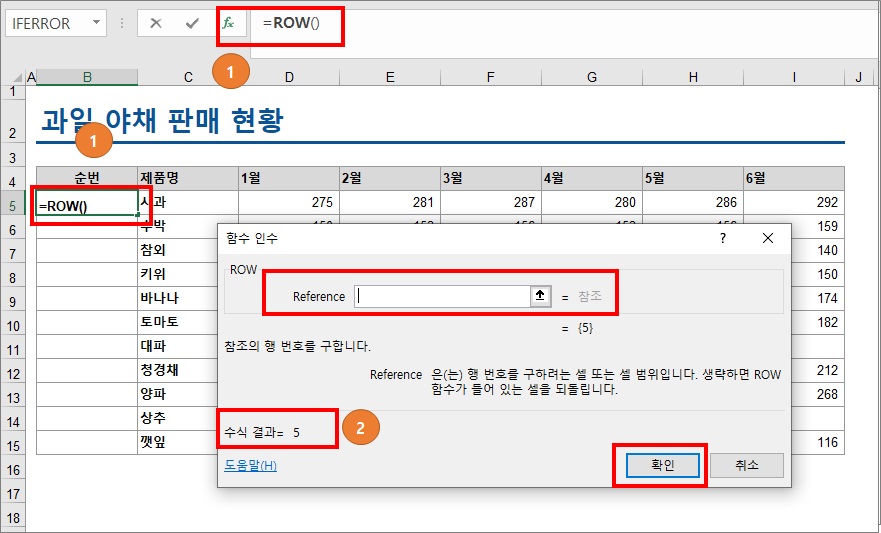 2번 : ROW 함수에 셀 지정 하기전에 "수식 결과 = 5"로 표시됨