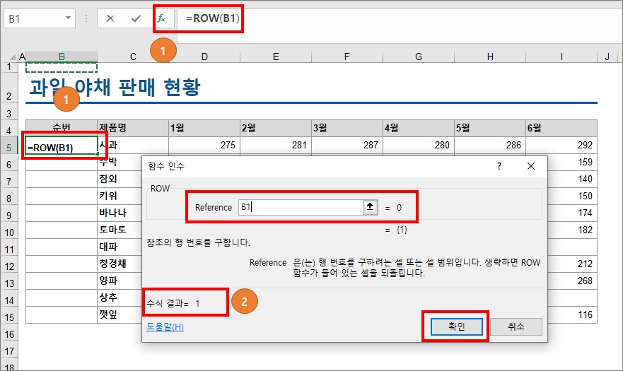 2번 : ROW 함수 B1 셀 지정 "수식 결과 = 1"로 표시됨