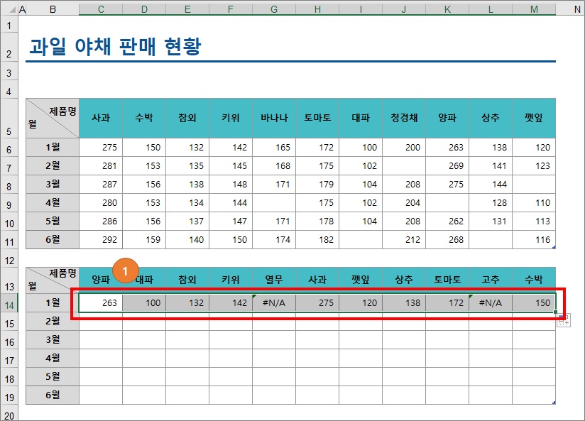 1번과 같이 채워 넣기를 하였는데 열무와, 고추는데이터에 없는 항목이어서 에러 메세지가 나옴