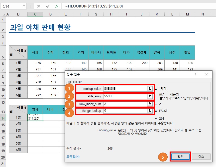 4번 : 확인을 클릭해서 HLOOKUP 함수를 실행합니다