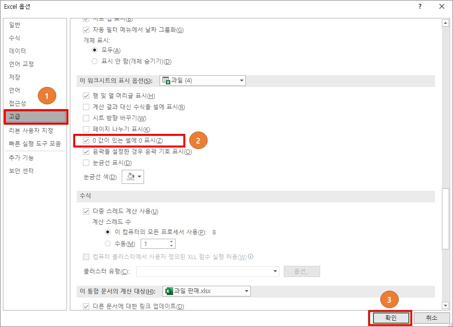 2번 : 0 값이 이쓴 셀에 0표시 체크를 클릭해서 체크를 빼주세요
