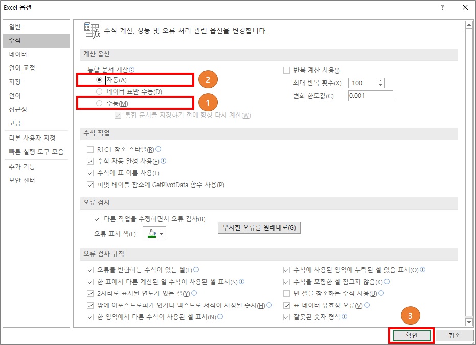 1번 : 엑셀 저장해야지 될 때 옵션은 수동이 체크되어 있습니다.