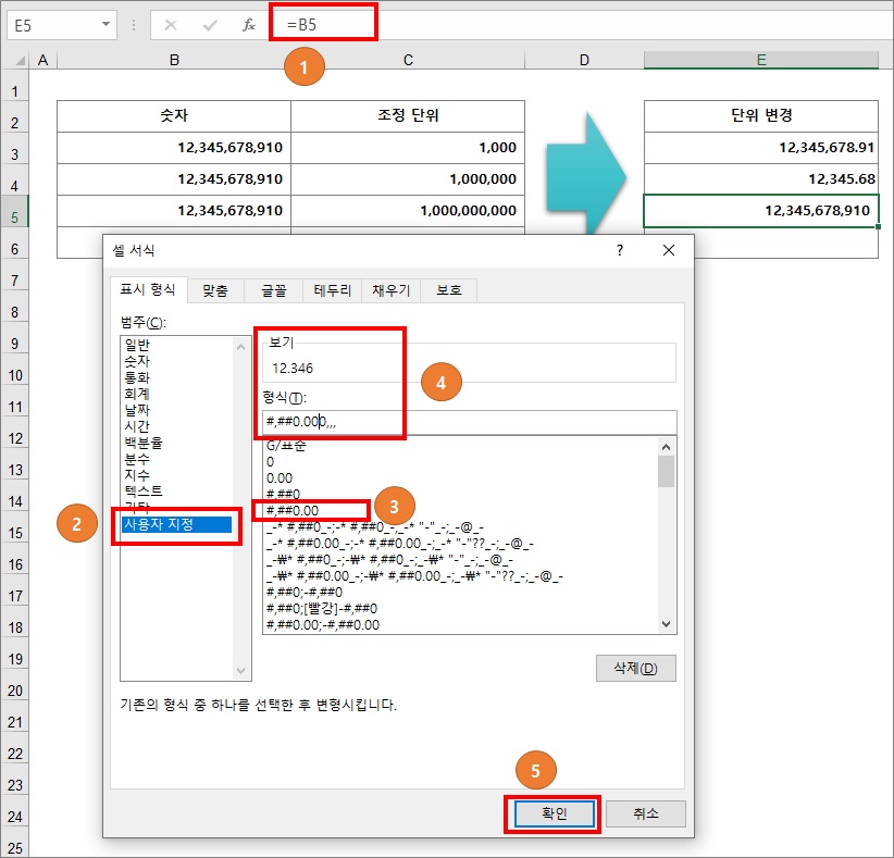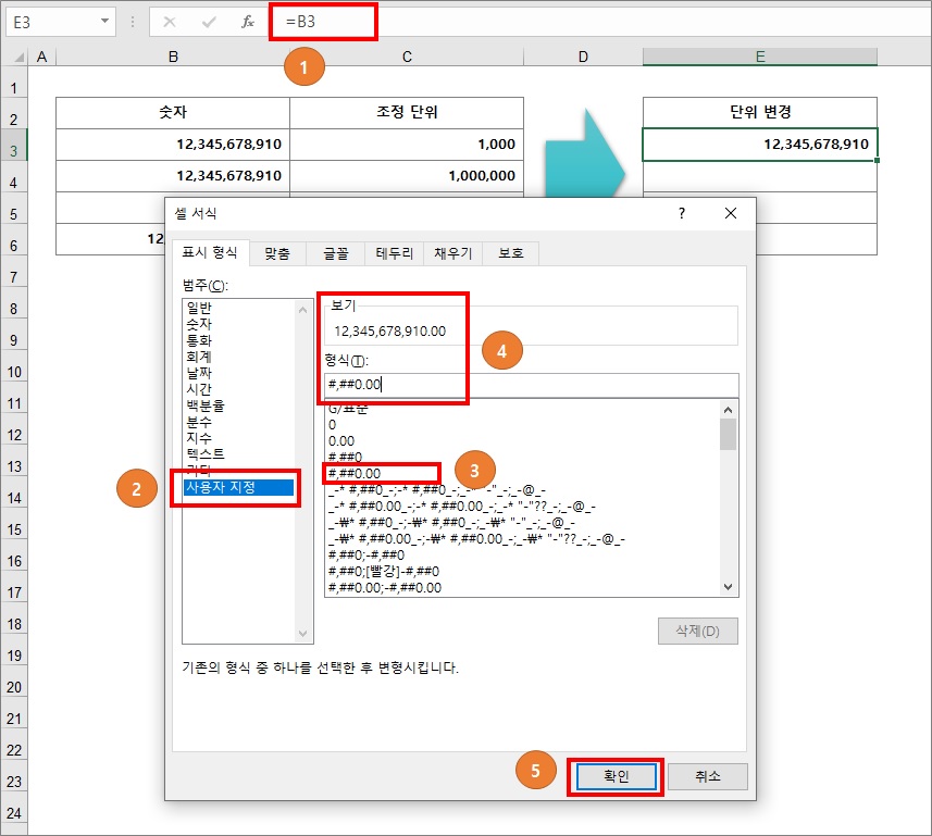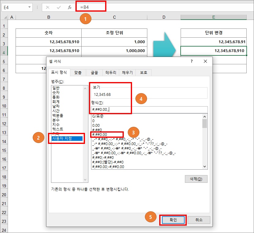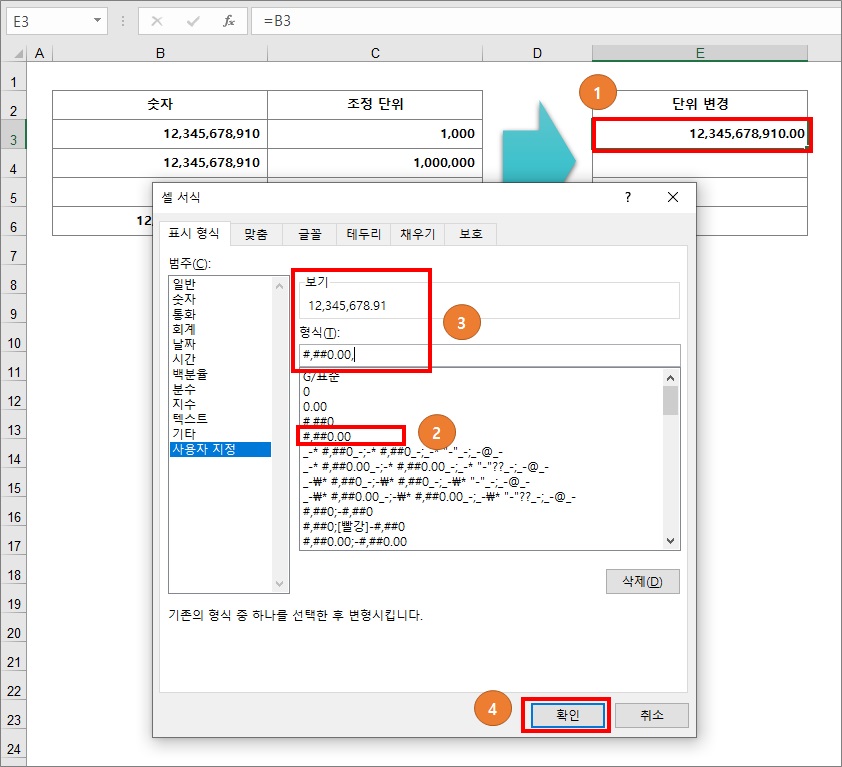 4번 : 형식에서 0 추가 하고 쉼표 3개 ,,, 입력 후 셀에 어떻게 보여지는 보기 참고 원하는 형태가 맞으면