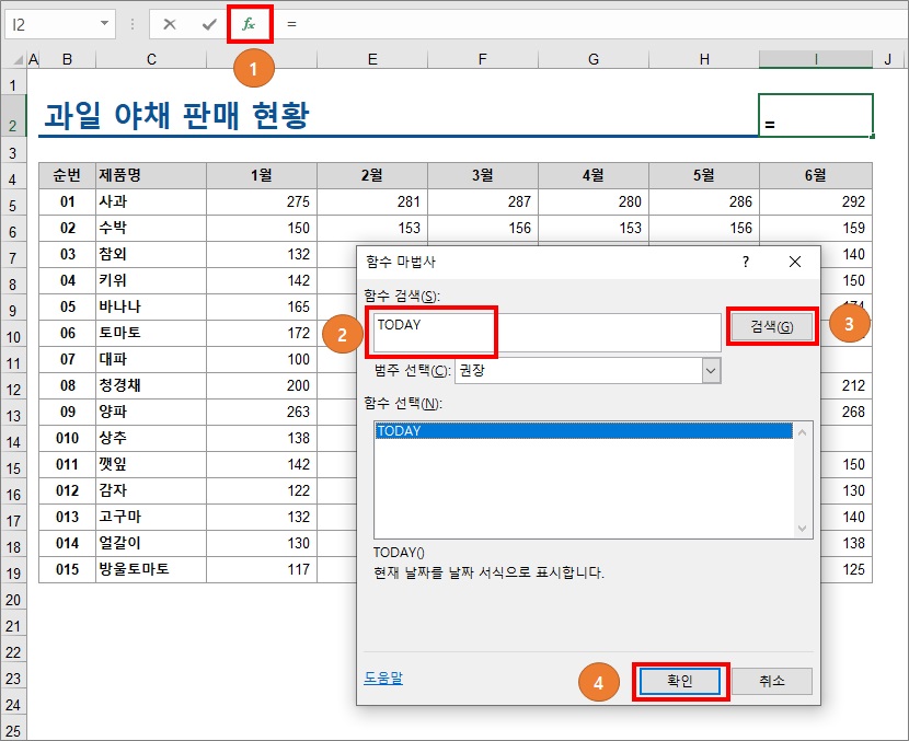1. 함수 마법사를 통해서 TODAY 함수 불러오기
