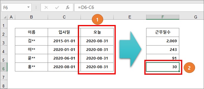 엑셀 오늘 날짜 함수 근무일수 구하기 (TODAY 함수)