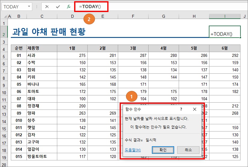 1번 : 함수 마법사를 통해사 TODAY 함수를 불러왔지만 특별한 서식이 필요 없어 확인만 클릭하면 됨