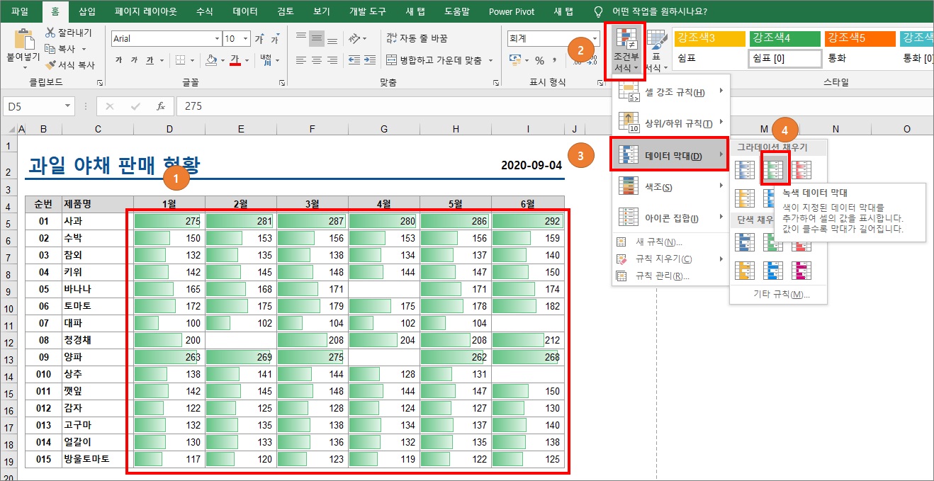 아래 그림처럼 셀안에 자동으로 데이터를 비교하여 데이터가 높으면 색 막대가 길게 나타납니다.