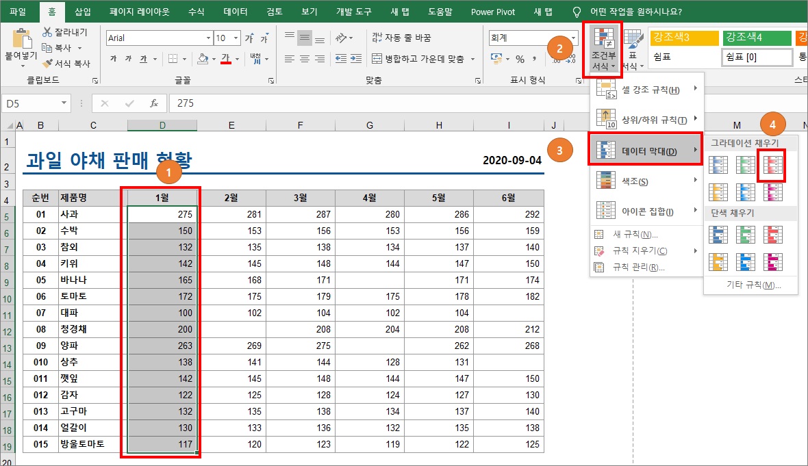 1번에 데이터 막대가 삽입되었는데 이것의 뜻은 전체 범위 기준으로 나온 데이터 막대입니다.