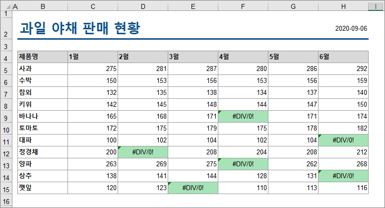 상황 : 아래 색깔이 들어가 있는 오류 셀을 안보이게 출력해보세요
