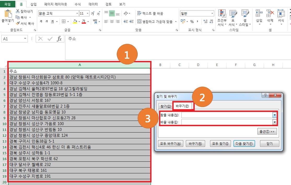 2번 : 찾기 및 바꾸기를 실행합니다 (단축키 Ctrl + F) 그리고 바꾸기를 클릭합니다.