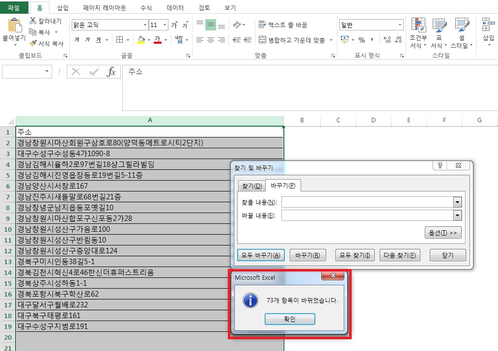 3. 아래처럼 73개가 바뀌었다는 항목이 나오고 A열을 보시면 빈칸이 사라졌습니다.