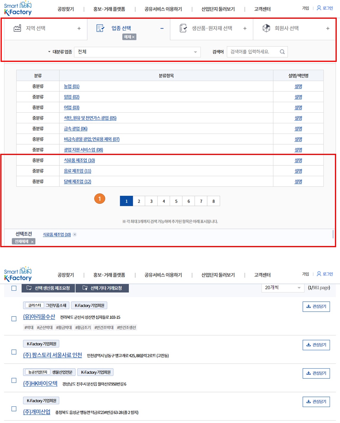 3. 업종을 선택해서 식품제조업을 선택해보았습니다.