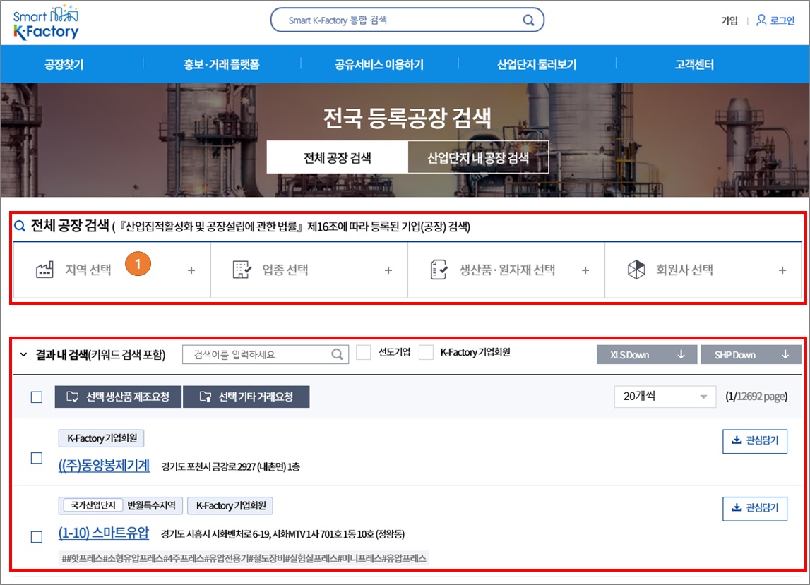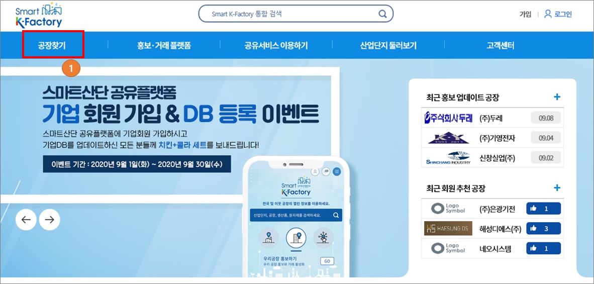 1. 스마트 K-팩토리 사이트에서 공장 찾기를 클릭해서 검색해보세요