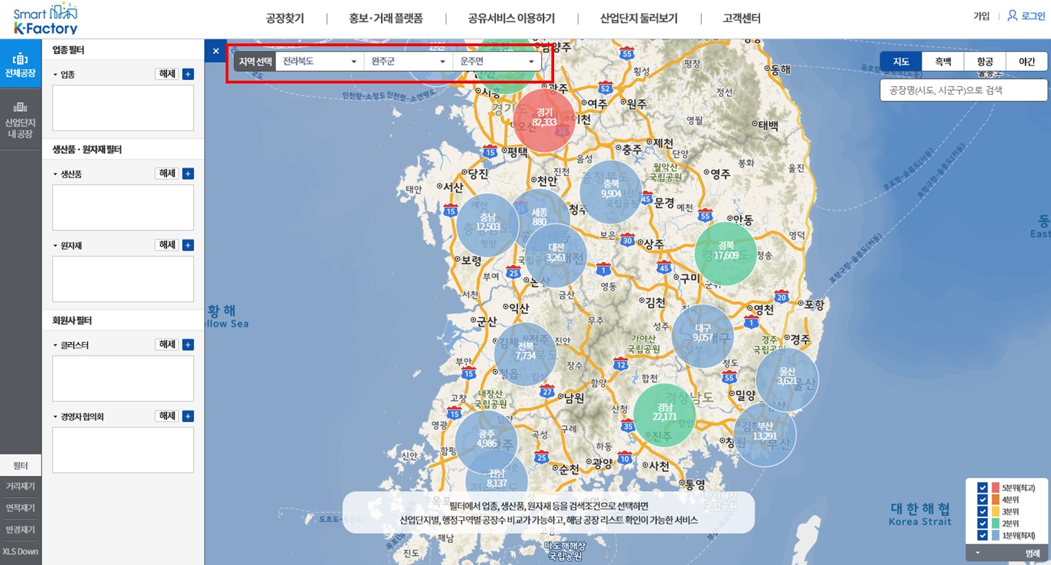 지도에 각 지역에 등록되어있는 공장 리스트가 숫자로 표시됩니다.