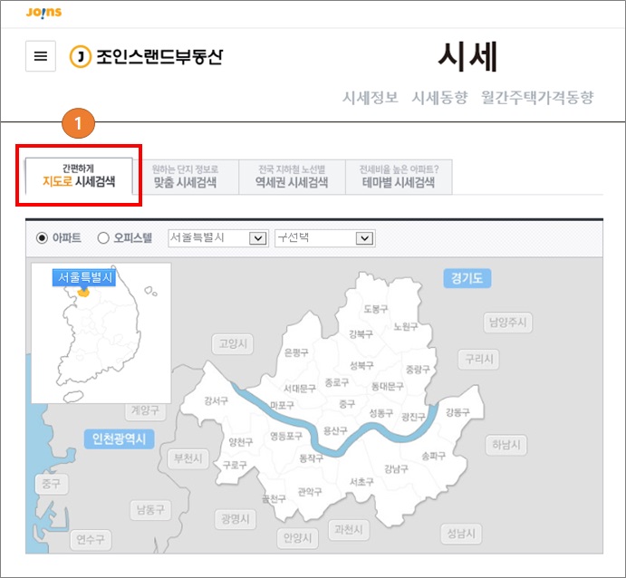 4가지로 분류로 조회가 가능하며 1번을 보면 지도로 시세 검색이 가능합니다.