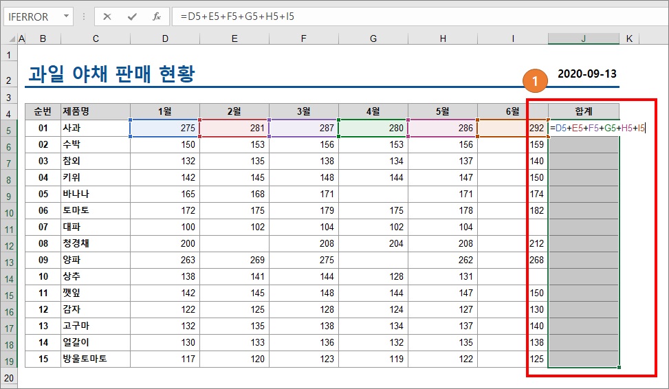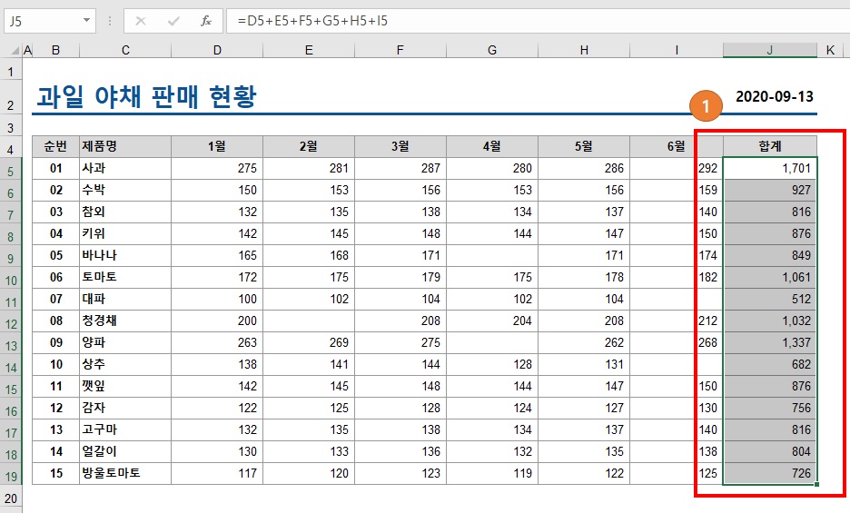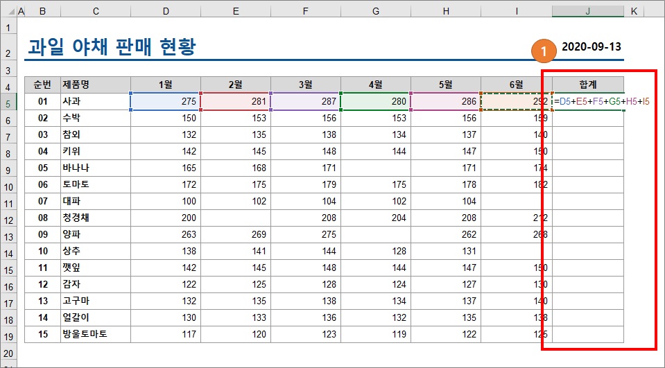 J5에 1월부터 6월까지 셀 더하기를 수식으로 적용합니다.