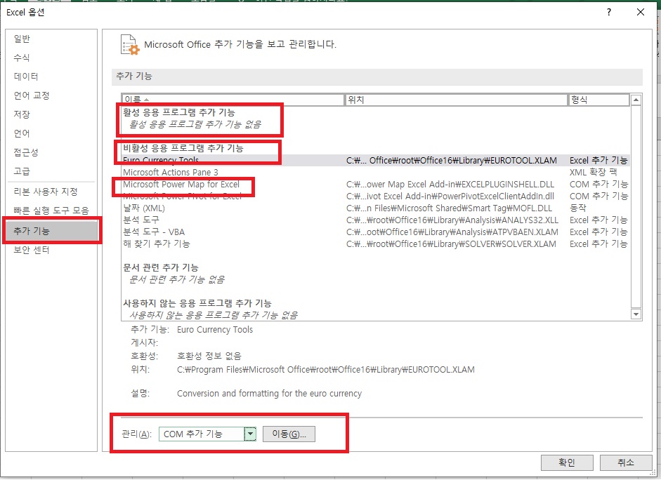 2. 옵션에 추가 기능으로 들어가시면 응용 프로그램중에 활성 비활성이 보입니다.