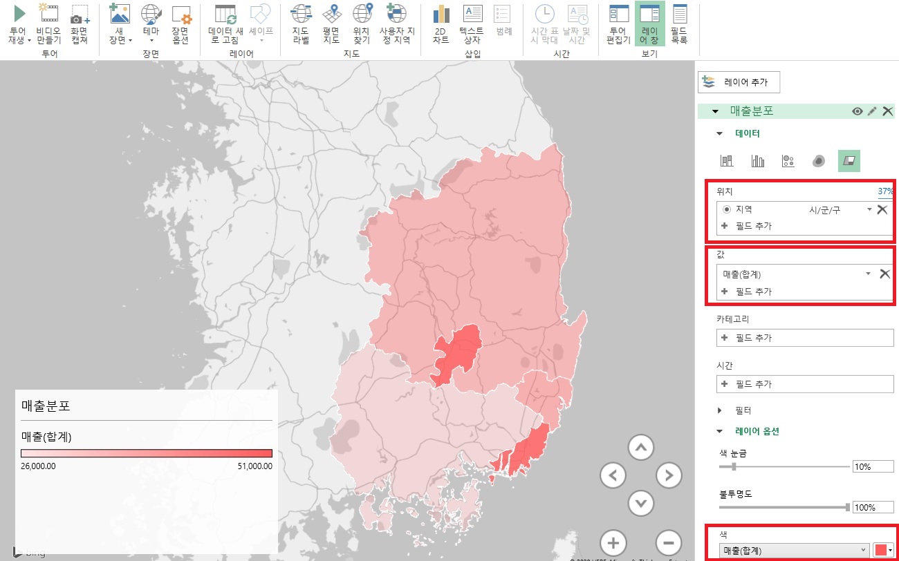 아래처럼 시도별 매출 비중을 색상으로 둘 수도 있고, 지도에 막대그래프를 통해서 매장별 매출도 나타낼 수 있습니다.
