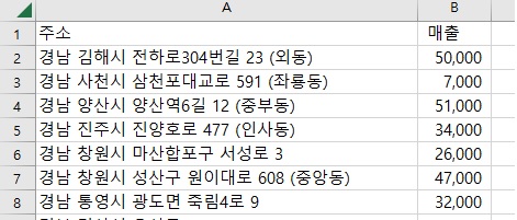 예제 ) 엑셀 주소 데이터로 했습니다.
