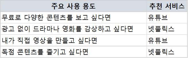 가볍게 무료로 즐기고 싶다면 유튜브, 프리미엄 콘텐츠를 광고 없이 보고 싶다면 넷플릭스를 선택하면 좋아요!