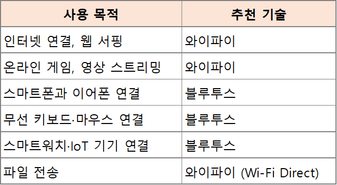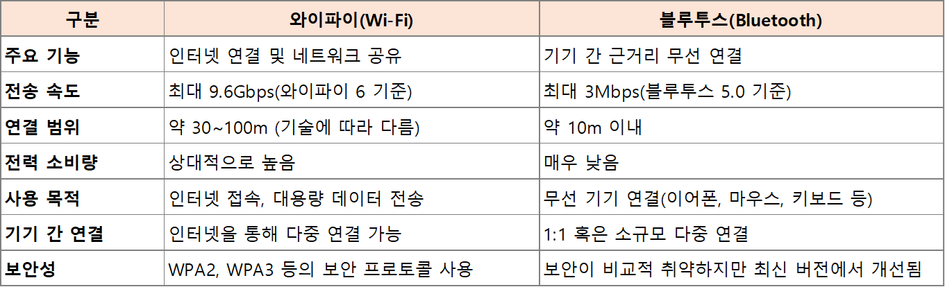 와이파이와 블루투스의 기본 개념, 주요 차이점, 장단점 및 활용 사례를 비교하여 어떤 상황에서 어떤 기술을 사용해야 하는지 설명해드리겠습니다.