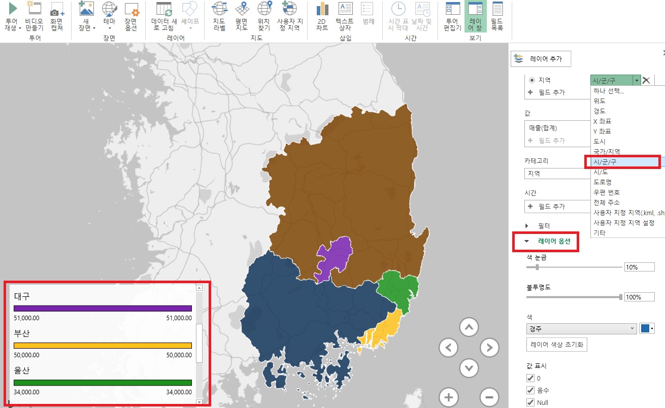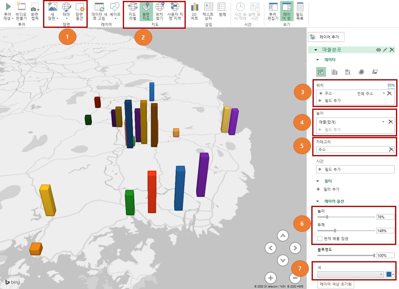 아래처럼 시도별 매출 비중을 색상으로 둘 수도 있고, 지도에 막대그래프를 통해서 매장별 매출도 나타낼 수 있습니다.