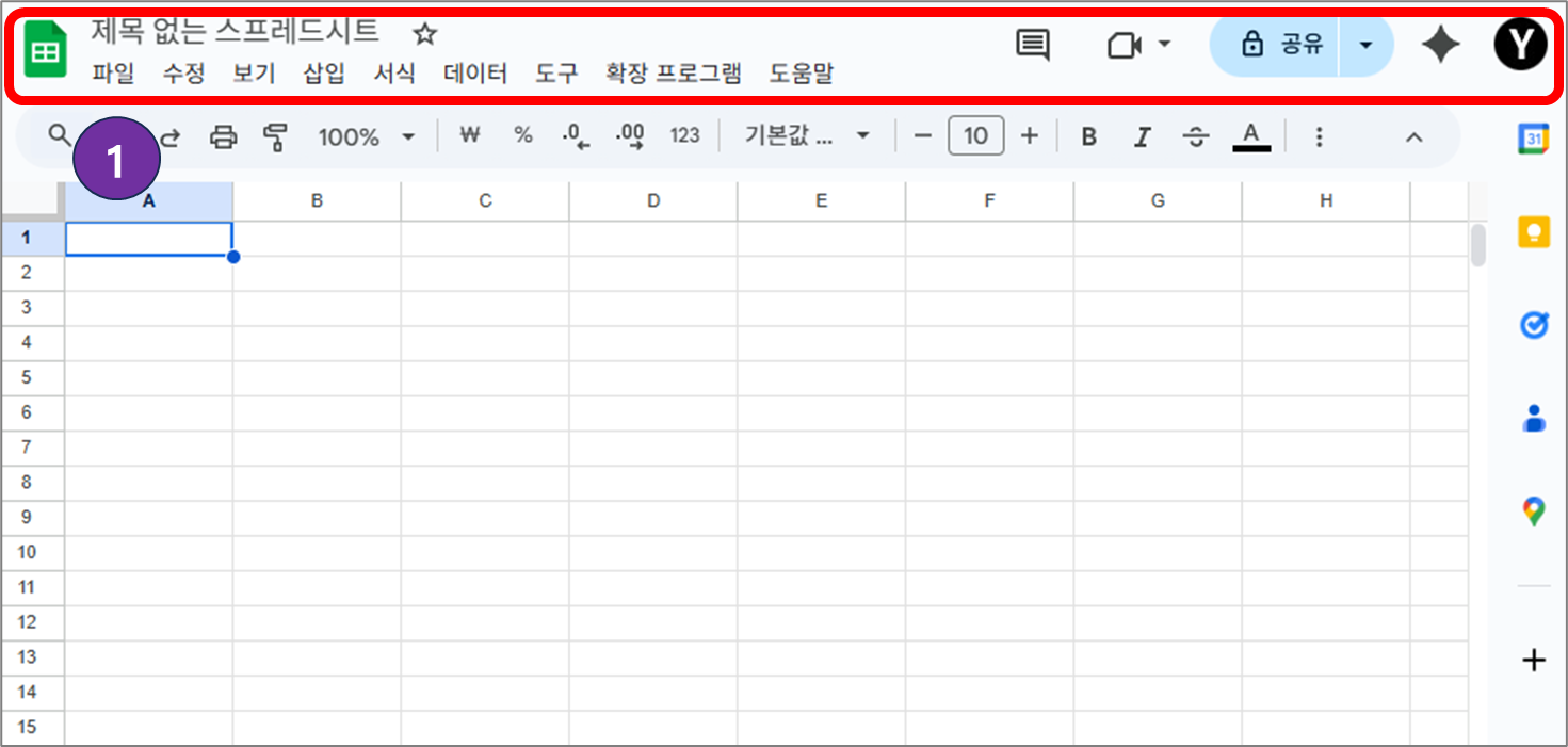 1번으로 표시된 부분이 구글 스프레드 시트의 메뉴바 입니다