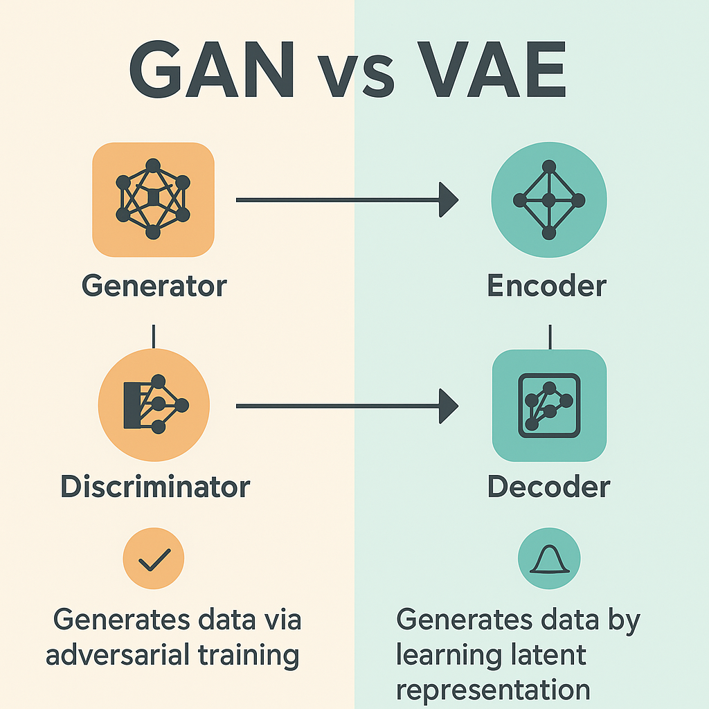 GAN과 VAE는 둘 다 새 데이터를 만들지만, 작동 방식이 다릅니다. 그 차이를 아래에서 더 자세히 살펴보겠습니다.