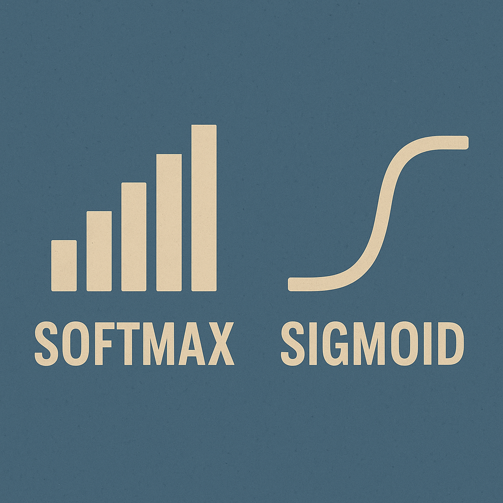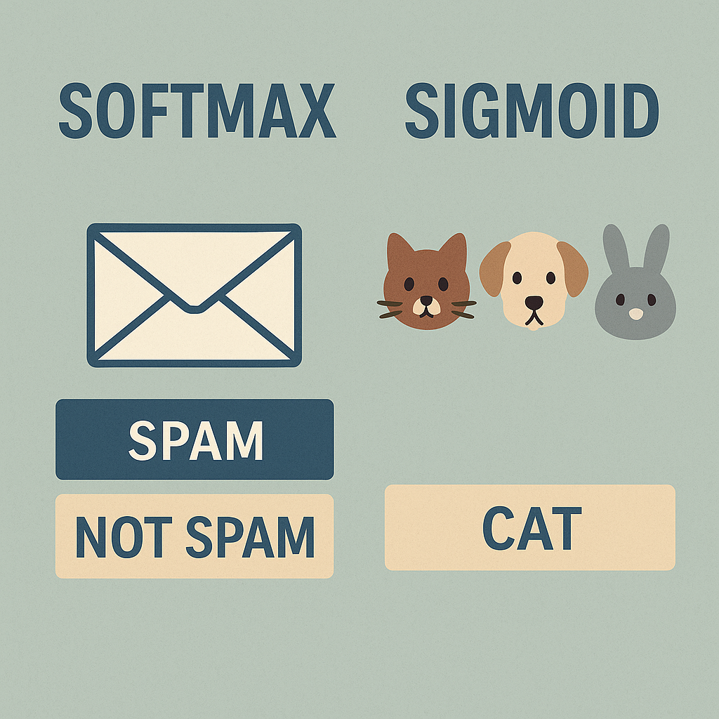 SIGMOID는 각 클래스가 맞을지 아닐지를 독립적으로 봅니다. SOFTMAX는 모든 클래스 확률을 동시에 계산해서 한 클래스의 확률이 올라가면 다른 클래스의 확률은 내려갑니다.