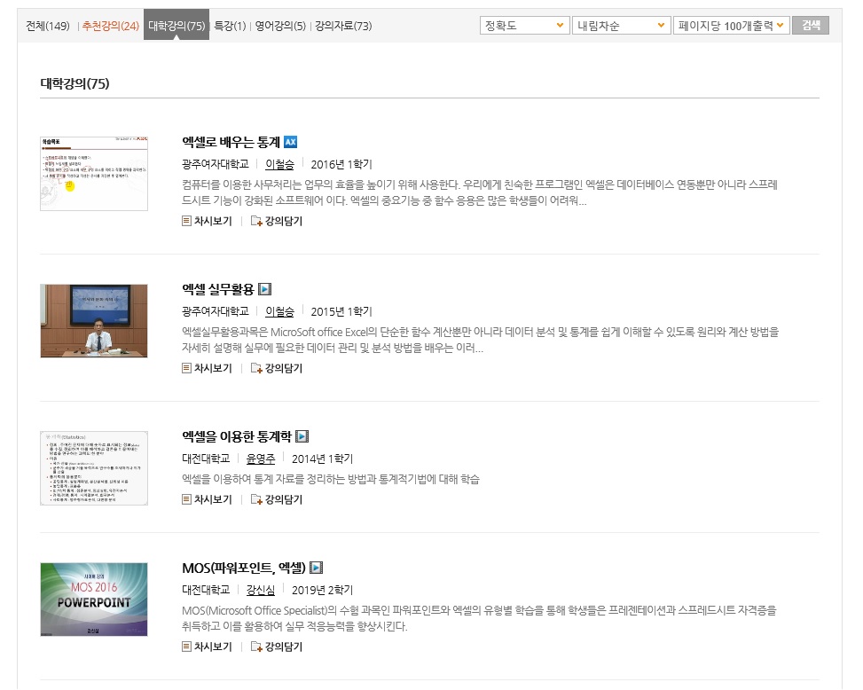 KOCW에서 엑셀로 조회를 해보시면 아래 사진처럼 5가지로 구분하여 볼 수 있습니다.