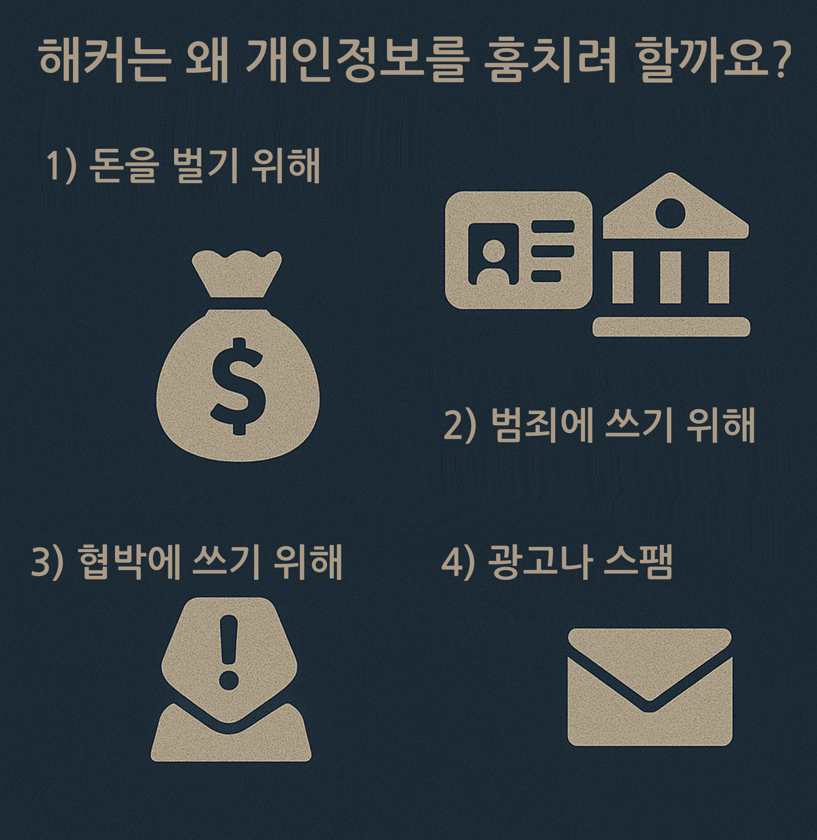해커가 개인정보를 훔치는 이유는 다양해요. 그중에서도 대표적인 이유는 다음과 같아요.