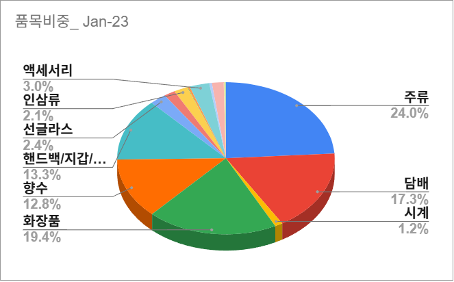 "JDC지정면세점 품목별 매출 실적" 데이터 중 Jan-23 품목별 비중입니다.