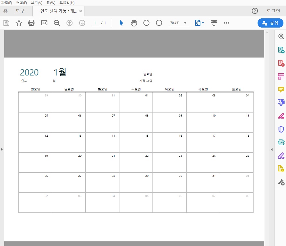 아래 화면에 있는 엑셀 달력을 PDF로 저장해보겠습니다.