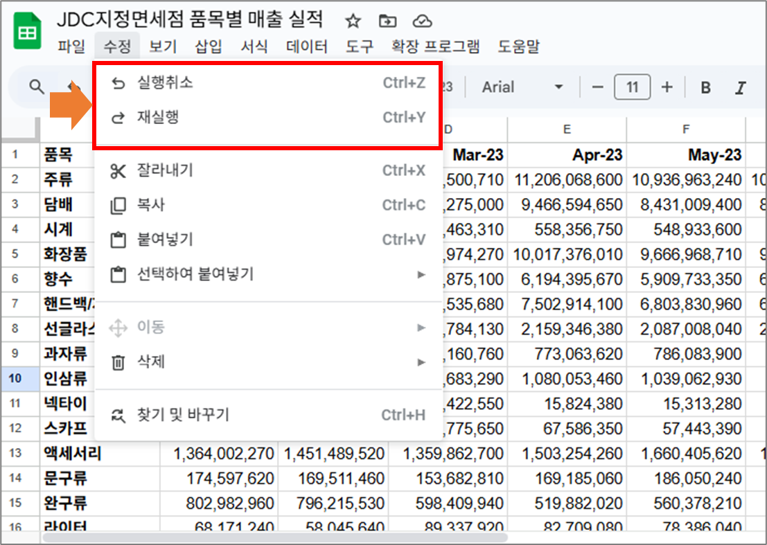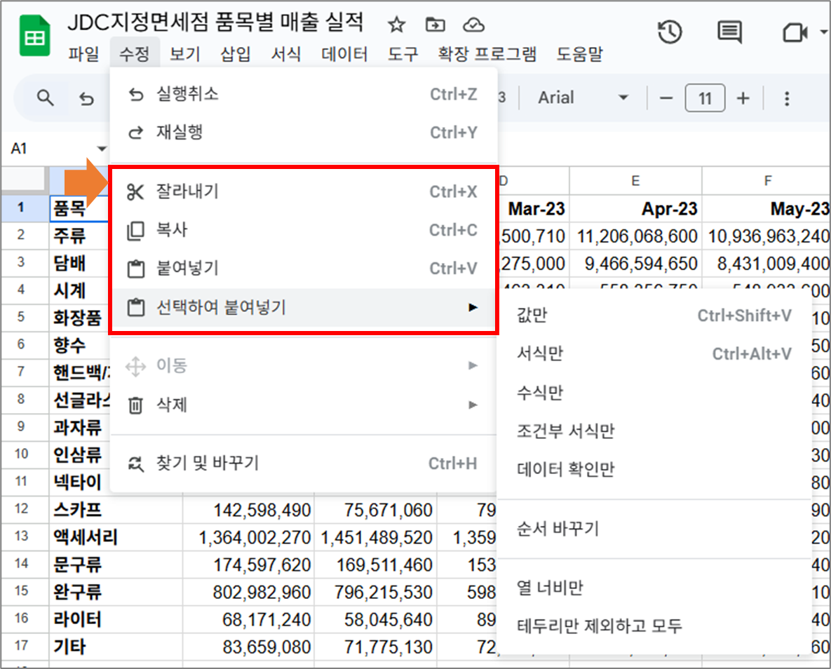 구글 스프레드시트 상단 메뉴 "수정" 완벽 정리