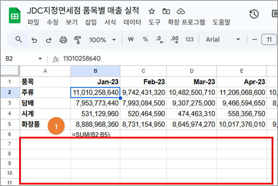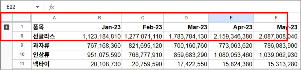 - 예시: 행 1개를 고정 하면, 아래로 아무리 내려도 1행은 계속 보입니다.