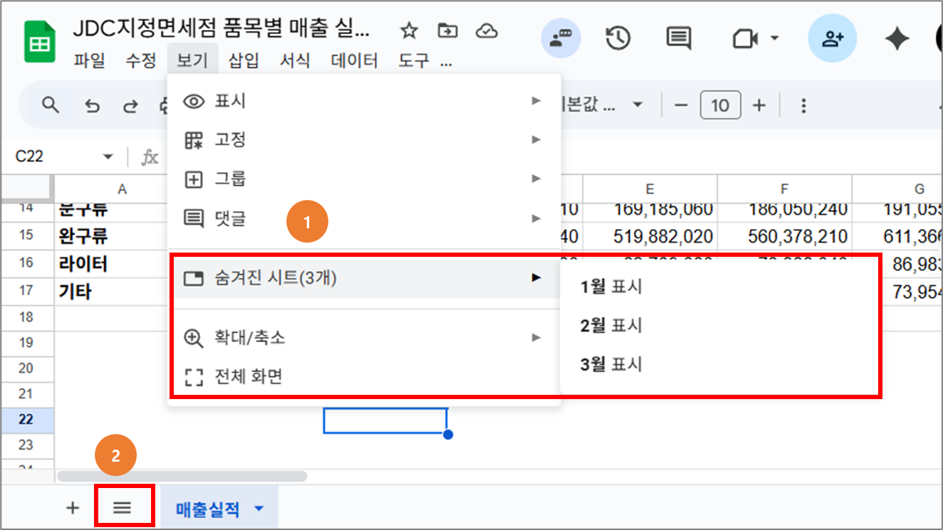 구글 스프레드시트 상단 메뉴 "보기" 완벽 정리